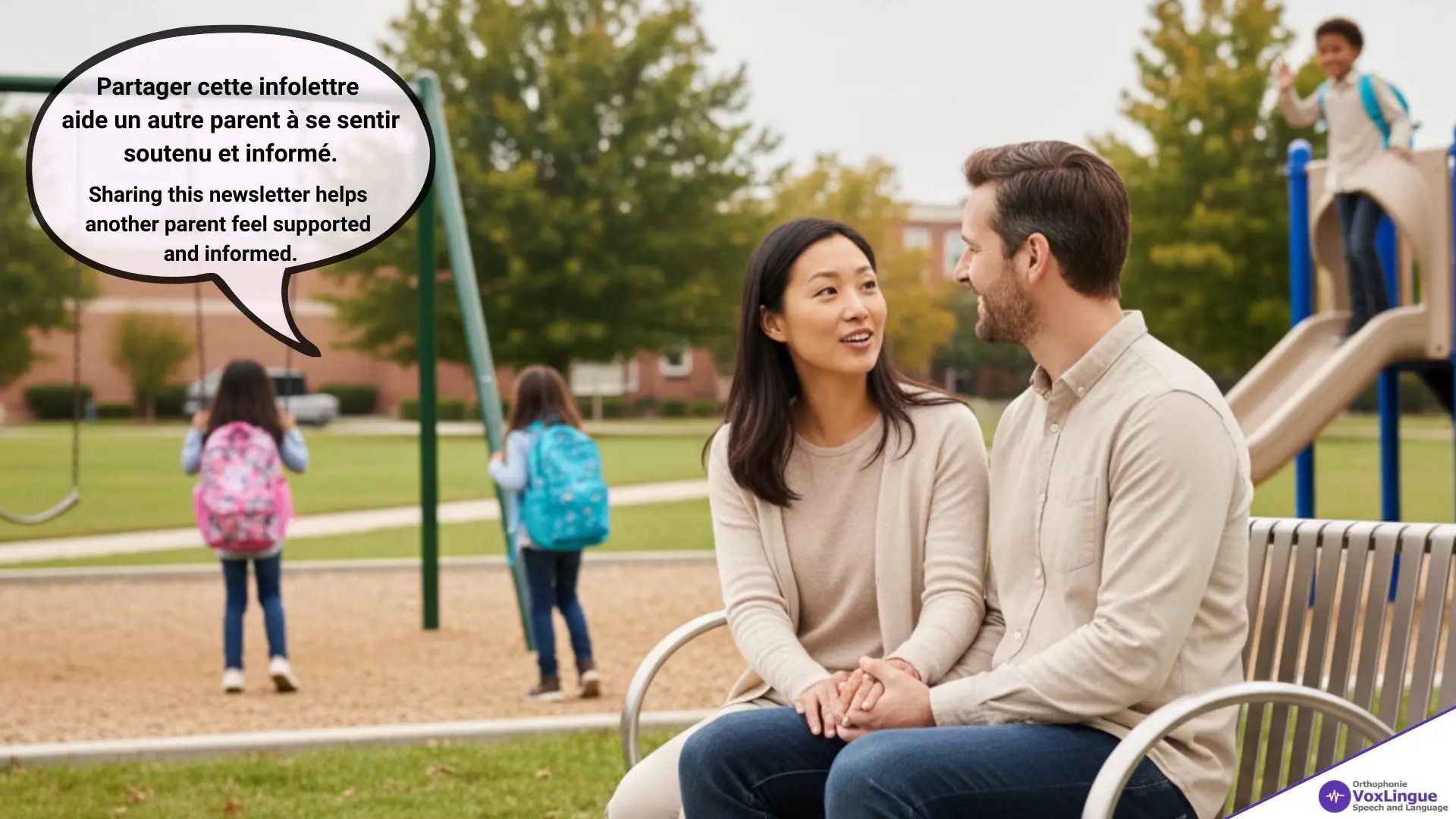 Nous vous encourageons également à partager cette infolettre avec un autre parent qui prépare son enfant pour la rentrée. En transmettant ces idées, vous contribuez à bâtir une communauté de familles qui considèrent la communication comme une pierre angulaire du développement. Et n’oubliez pas que VoxLingue est toujours là pour accompagner votre famille. Notre équipe est dédiée à offrir aux parents et aux enfants des outils, des stratégies et du soutien afin qu’ils puissent s’épanouir tant à l’école qu’à la maison.